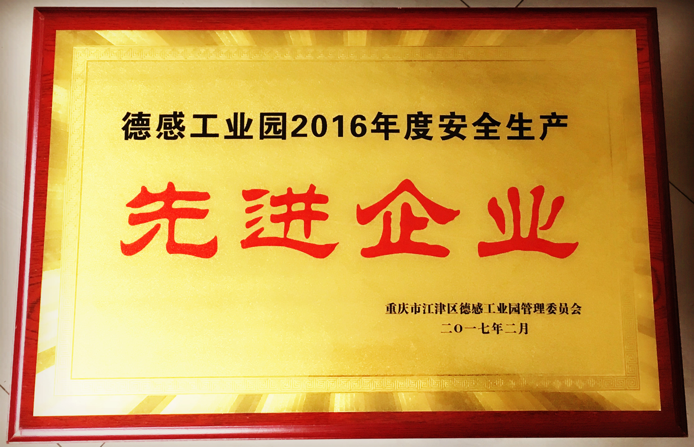 重齿机械有限公司被江津区德感工业园区管理委会评为“2016年德感工业园安全生产先进企业”。